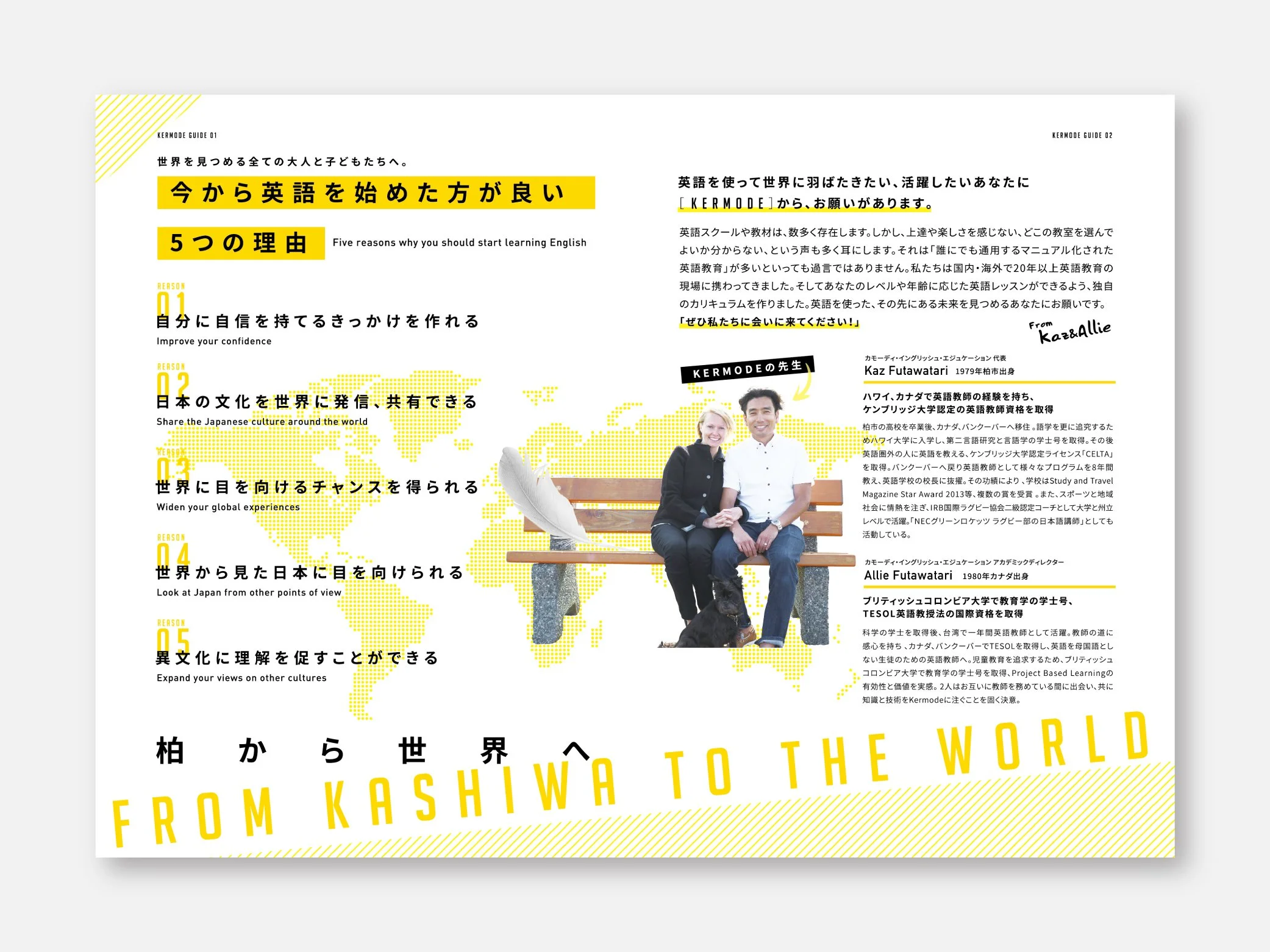 千葉県柏市の英会話スクール様の授業案内パンフレットを制作いたしました。英語習得にとどまらず英語を通じて視野を広げられる質の高いレッスンを展開していることをパンフレットにも表現しています。